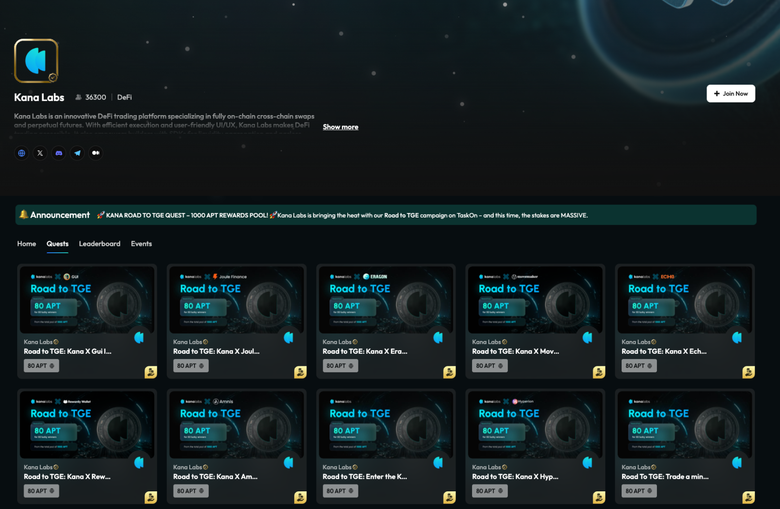 在 TGE 前夕,Kana Labs 通过 TaskOn 发布系列 Quest,借助数周任务挑战实现精准奖励与社区庆祝。将品牌叙事融入任务流程,使用户在参与中建立情感联结。