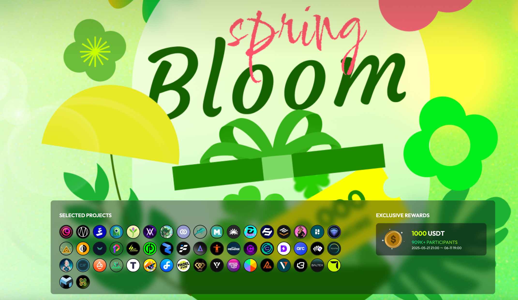 作为 TaskOn 的联合活动,最新一期 Spring Bloom 聚集 54 个项目,总奖池超 24000 USDT,加上额外项目代币奖励,吸引超过 90 万用户参与,彰显平台强大的流量聚合与分配能力。
