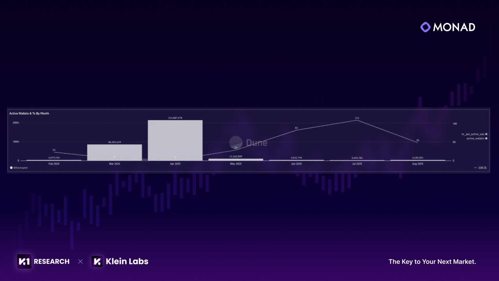 从 Monad 测试网在性能、用户参与和开发者活动方面的全面数据来看:数十亿级别的累积交易和 3 亿多活跃钱包体现了早期市场兴趣,但用户粘性和真实活跃度偏低;平均每月只有少数用户保持高频交易,且交易成功率稳定在 98% 以上,交易费用极低,表明核心技术架构能够支撑高负载但仍在爬坡阶段。