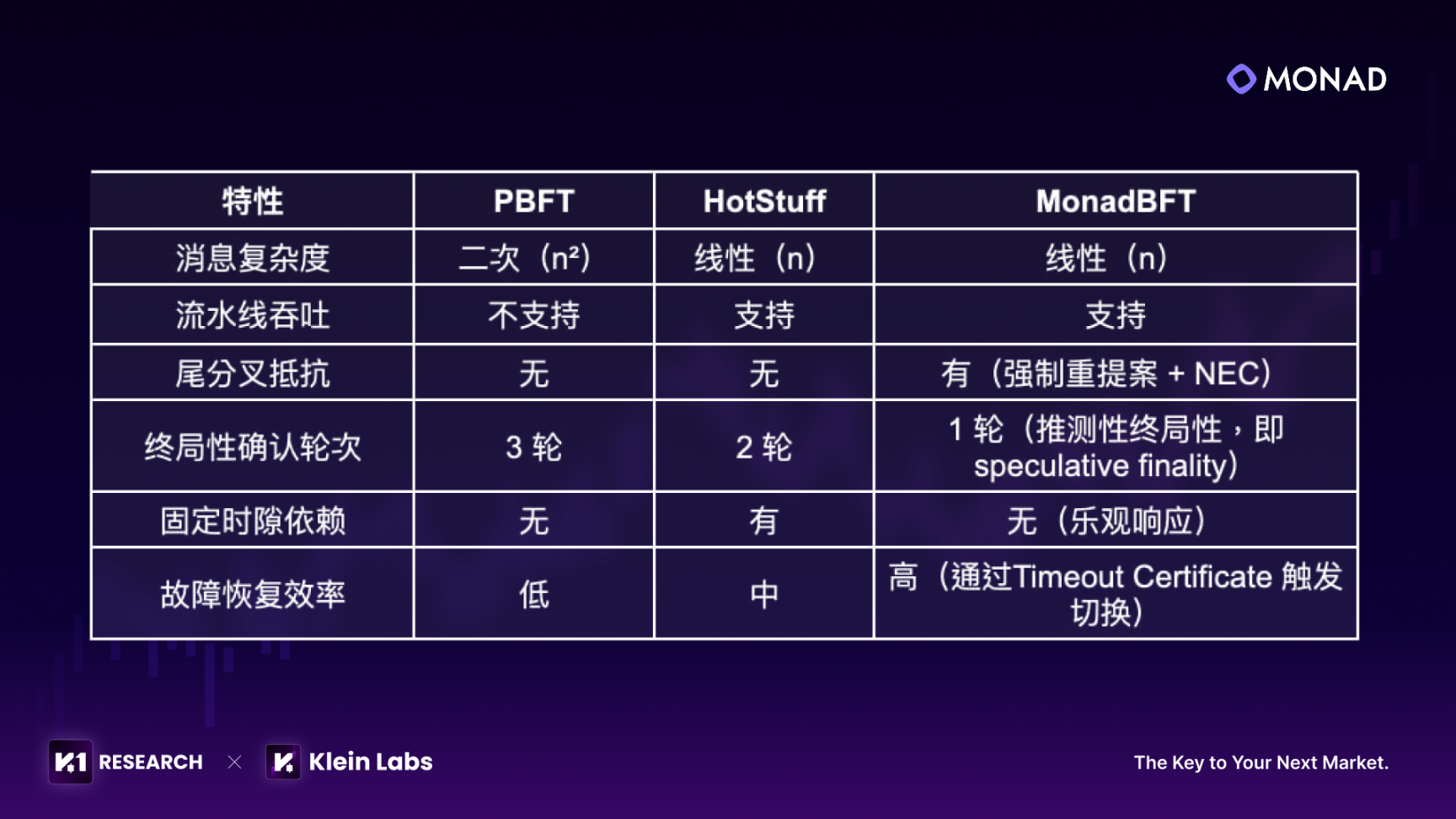 Monad 能实现高性能,核心之一是自主研发的 MonadBFT 共识机制。它基于 2018 年的 HotStuff 共识改进,既解决了传统 BFT 协议(比如 PBFT)节点多了消息就拥堵的问题,也修复了 HotStuff 常见的 “尾分叉” 漏洞,为整条链的高性能打下基础。