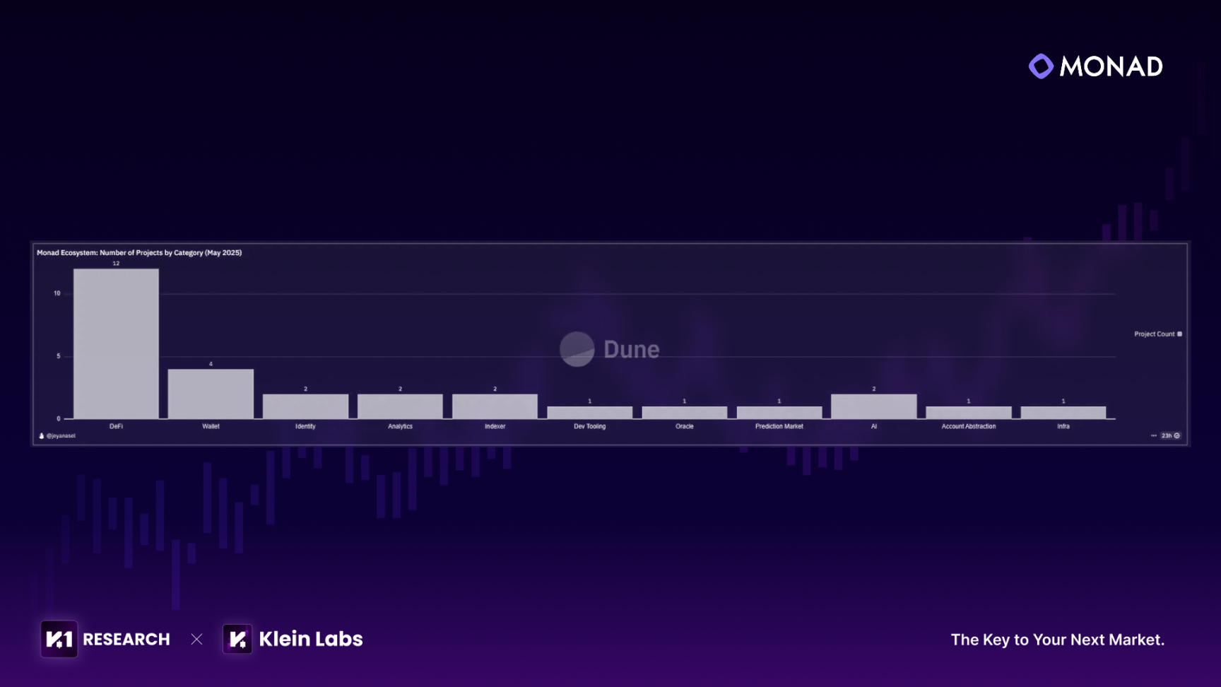Monad 生态呈现“DeFi 为核心,多赛道协同延伸”的格局:DeFi 类项目以 12 个的数量领跑,成为生态最活跃的核心赛道;钱包(Wallet)作为用户触达生态的关键入口,聚集了 4 个项目;同时,身份(Identity)、数据分析(Analytics)、基础设施(Infra)等“底层基建型” 赛道,以及 AI、预测市场(Prediction Market)等创新赛道均有项目落地,体现出生态从 “核心金融场景” 向 “底层支撑 + 多元应用” 的拓展逻辑。