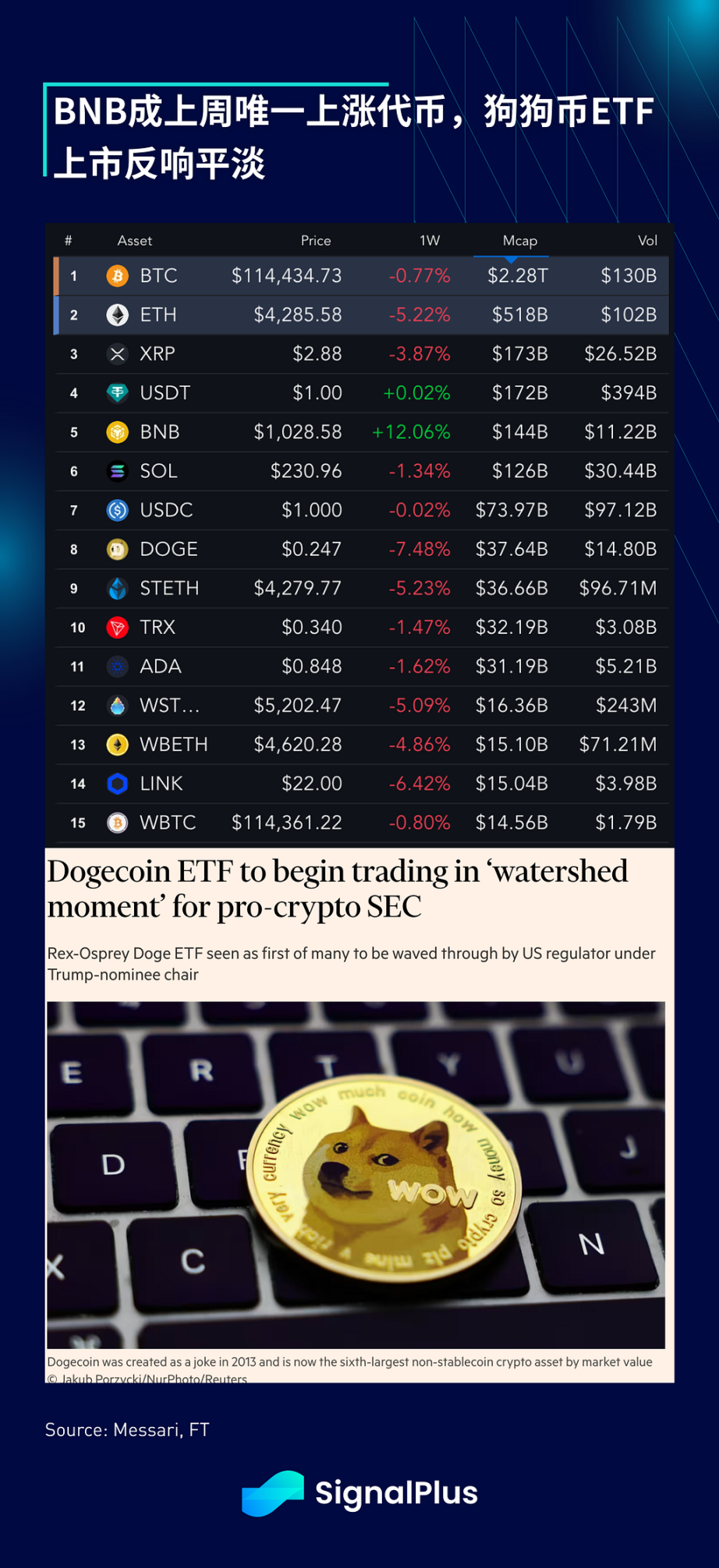 加密货币上周表现平淡,除币安 BNB 因成功推出数个代币(如 $ASTER)创历史新高外,主流币种普遍下跌。另一方面,狗狗币 ETF(DOJE)于上周四成功上市,未来数月可能迎来模因币主题 ETF 的上市潮。