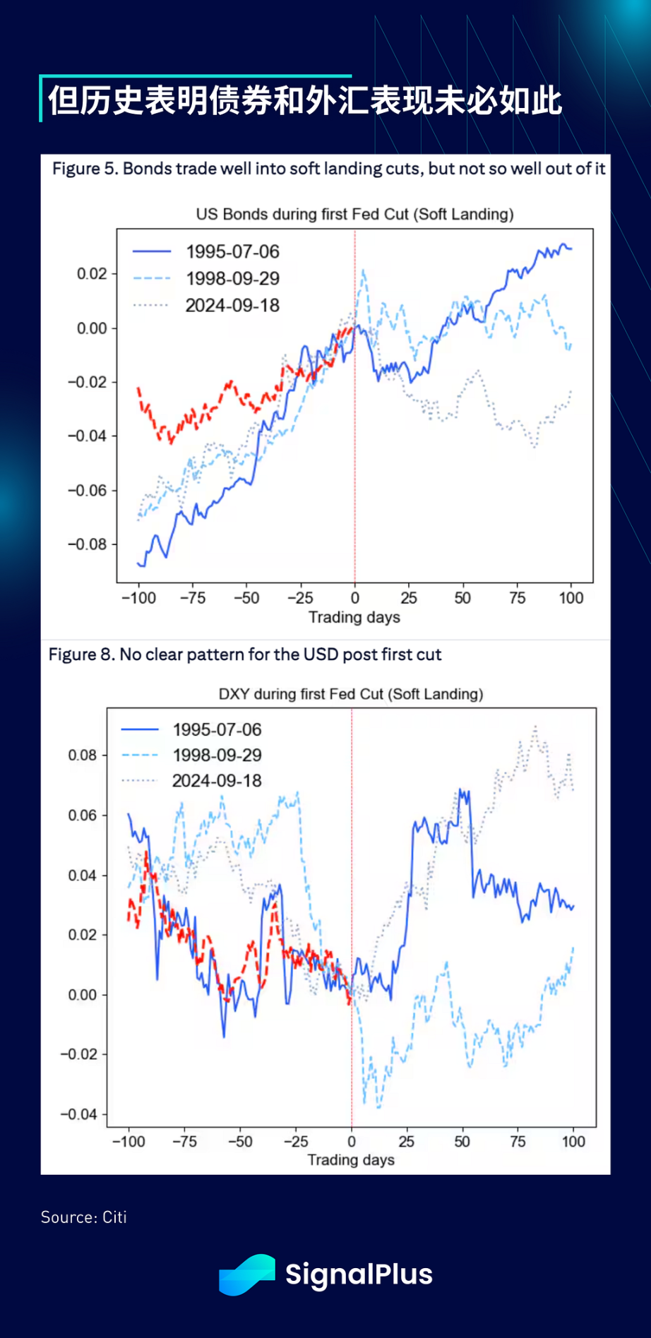 若美联储能成功实现软著陆,美股通常在首次降息前后表现良好,同时跑赢全球股票。相反债券表现则截然不同,收益前置化特征明显,且经济稳定时收益率往往重新走高。美元走势未见明显规律,因汇率波动更易受资本帐户和经常帐户流动的综合影响,不过可以确定的是特朗普政府本次对美元走弱的期望更为明确。