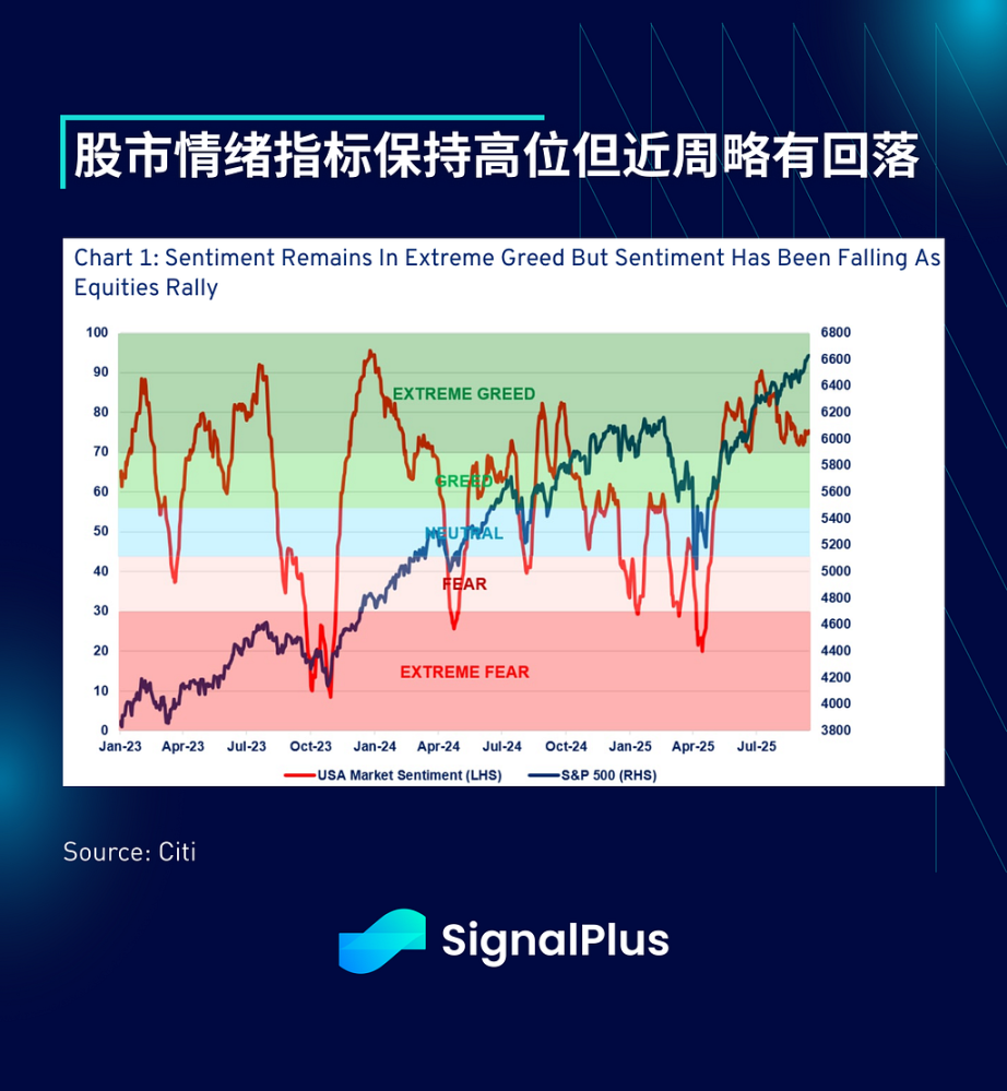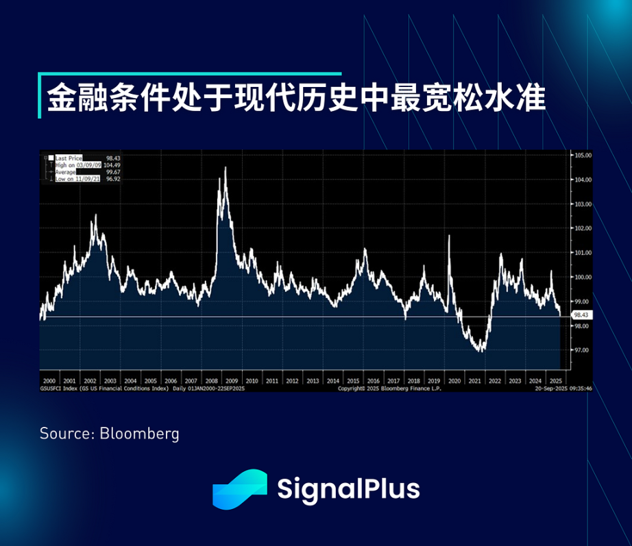 风险情绪指标仍处于极端区域,但夏末以来已略有缓和,尽管对股价影响有限。风险偏好继续受宽松货币环境驱动,当前金融条件仍处于历史最宽松水准,这主要得益于美联储近期的鸽派政策转向。