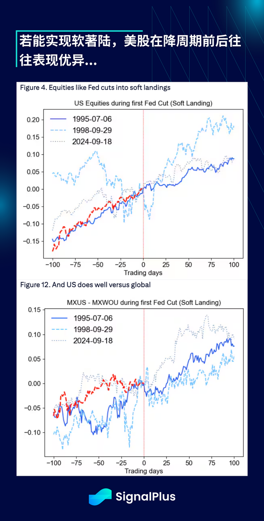 虽然股债市场分歧并非首次出现 — — 股市定价暗示衰退概率接近零,而固收市场定价反映概率近 50% — — 但回顾两者在美联储宽松周期中的表现差异仍具启示意义。