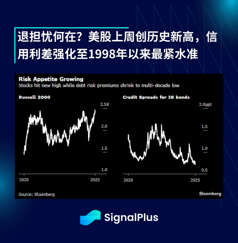据彭博社报导,随著市场狂热情绪持续高涨,标普 500 指数、纳斯达克指数、道钟斯工业平均指数和罗素 2000 指数在同一周内全部创下历史新高,这是过去 100 年来第 26 次出现这种现象。与此同时,投资级信用利差收窄至 1998 年以来最低水准,该指数仅比同期国债收益率高出 0.72%,若经济真正恶化,几乎无法提供任何保护缓冲。