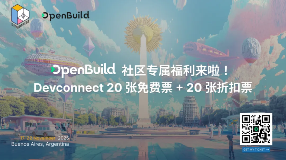 好消息好消息!以太坊全球嘉年华即将来到阿根廷:Devconnect!我们为 OpenBuild 社区小伙伴争取到了 🎫 20 张 Devconnect 免费门票 以及 🎫 20 张 5 折门票。特别面向 OpenBuild 社区成员开放申请!这是一次难得的机会,助力更多社区成员亲身参与今年最盛大的以太坊开发者年度盛会。