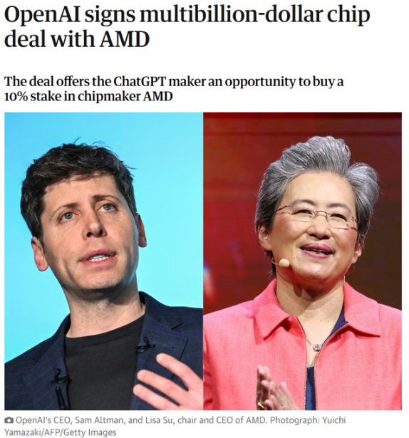 OpenAI 甚至与 AMD 签署了一项价值数十亿美元的协议,不仅是为了购买芯片,更是为了确保长期的 GPU 供应,甚至收购了 AMD 高达 10% 的股权。那是垂直统治,控制着所有未来 AI 所依赖的原始计算力。