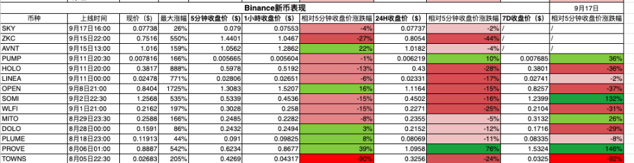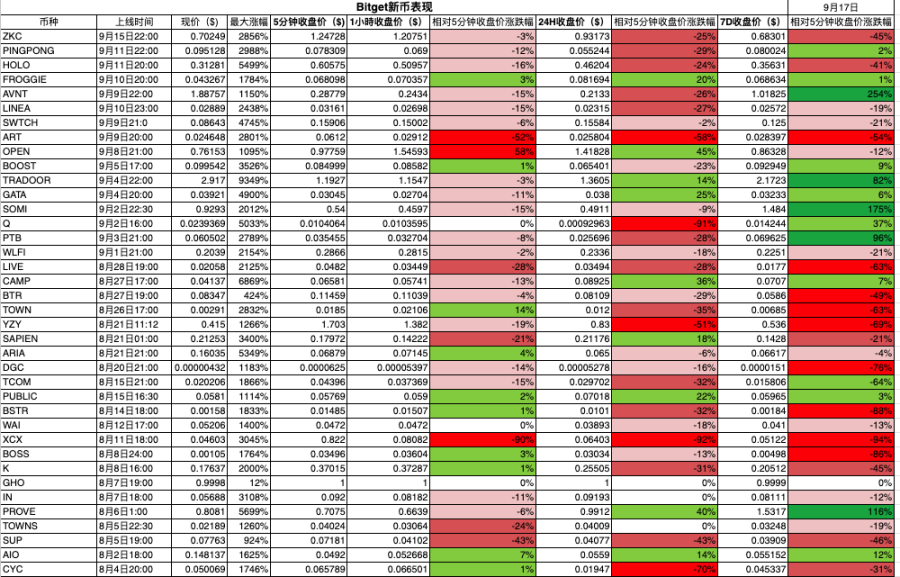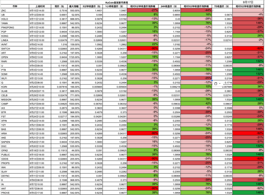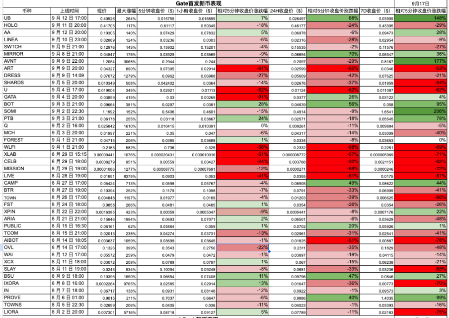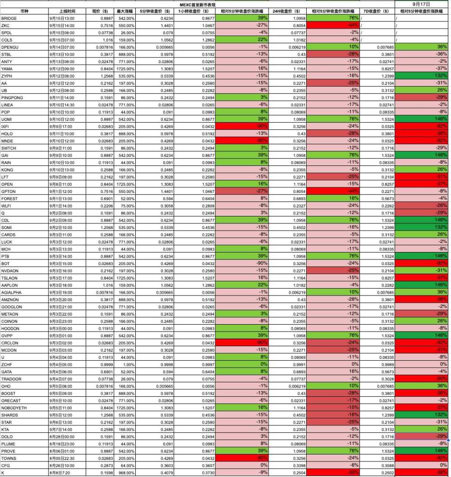 除了上币数量,新币上市后的价格表现是评估各交易所「上币效应」的核心指标。我们将各平台新币在不同时间周期(5 分钟、1 小时、24 小时、7 日)的价格涨跌幅进行横向对比,观察哪些交易所的新币涨幅集中、哪家平台破发(上市后下跌)比例较高。