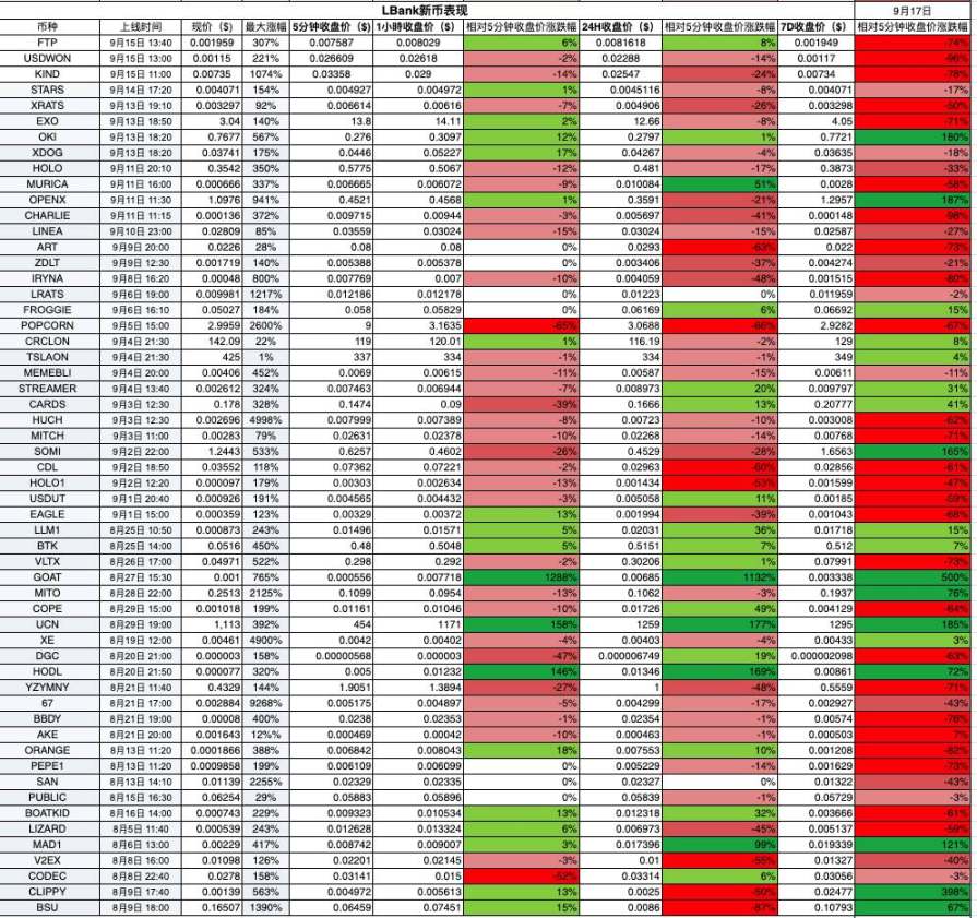 LBank —— 数量最多,上币如「机关枪」般高频。据不完全统计,LBank 在该期间上线了数十枚甚至上百枚新币,延续了上半年「日均 2-3 个新币」的猛烈节奏。这种高密度上新为市场提供了众多试错机会,但项目质量良莠不齐,七日内价格剧烈分化的现象突出(此前 5-6 月样本中有九成项目一周内出现大幅涨跌分化)。