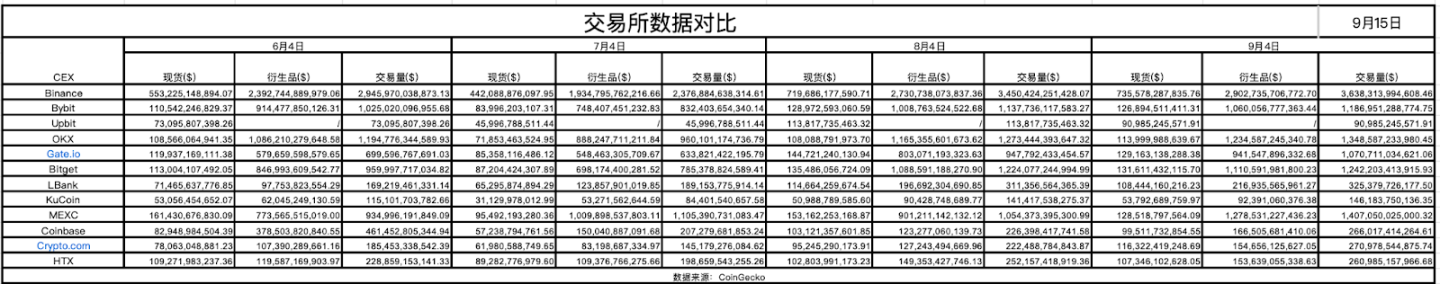 Gate:季度总量增幅约 +53.0%。Gate 作为老牌山寨所,Q3 在交易量上再上新台阶,增长主要由衍生品驱动(衍生品环比 +62%)。这与 Gate 紧抓热点上线了众多新币永续合约有关。