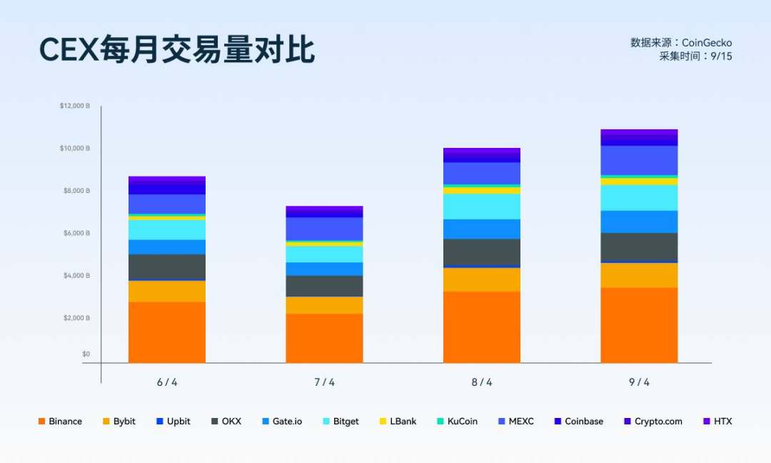 Binance:季度增幅约 +23.5%。作为基数最大的交易所,币安能取得 23% 的环比增长也属可观。这主要归功于 Q3 市场交易情绪回升,头部币种和部分小币在币安都有放量。币安本身战略没有大的调整,甚至在美国监管压力下缩减了一些高风险产品,所以其增长基本代表大盘平均水平。市场份额方面,币安小幅下滑了一些(因为中型所增速更高),但仍牢牢占据龙头地位。