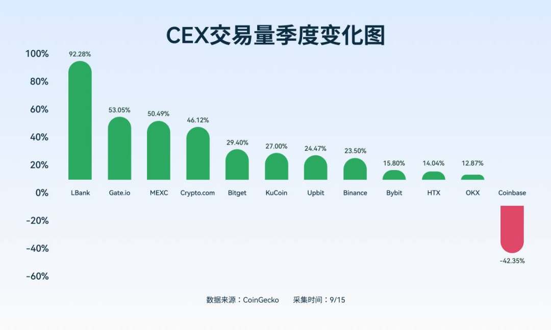 观察交易量趋势,我们对比 2025 年 6 月初和 9 月初的数据,计算了各交易所总交易量的季度变化率。这能够反映哪家平台在近季增长迅猛,哪家相对停滞: