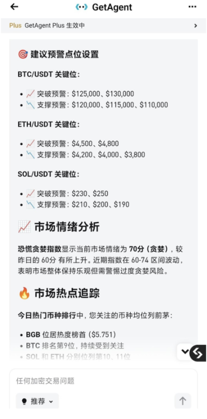 假期开始前,我们需要通过一些对话简单设置一下 GetAgent,以做好万全准备。登录 Bitget App,进入“常用功能”或资产页面,点击 GetAgent 聊天界面,即可自动解锁 Plus 版。这里有一个小 Tips,即在和 GetAgent 聊天时,尽量将相关问题集中在一个对话里,GetAgent 会结合上下文提供更好的解答和策略。