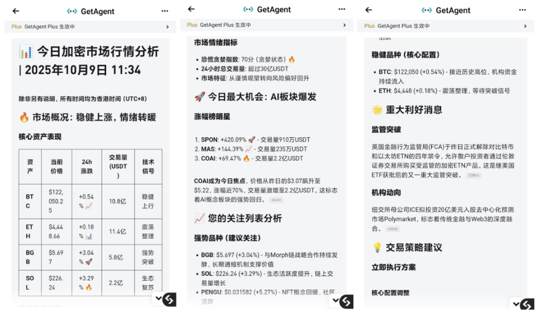 让 GetAgent 提供实时大盘走势分析、热门币种推荐,它会替你筛选 2-3 个新的交易机会,快速把握市场脉搏。