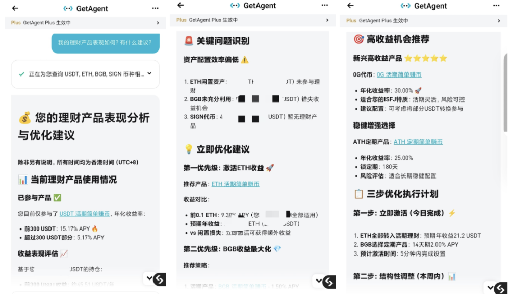 整体分析持仓后,你还可以进一步通过 GetAgent 分析你的理财产品。在给出收益表现评估后,GetAgent 会检查你持仓资产中可以参与的理财机会,并给出优先级,以及预估收益。此外,它还会推荐一些高收益机会,并给出时间线为两周的可执行方案。