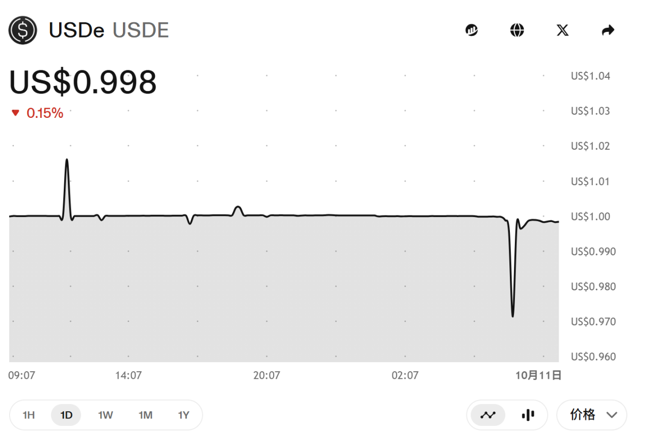 不过据链上数据显示,USDe 并未大幅脱锚,最低仅下探至 0.97 美元附近。