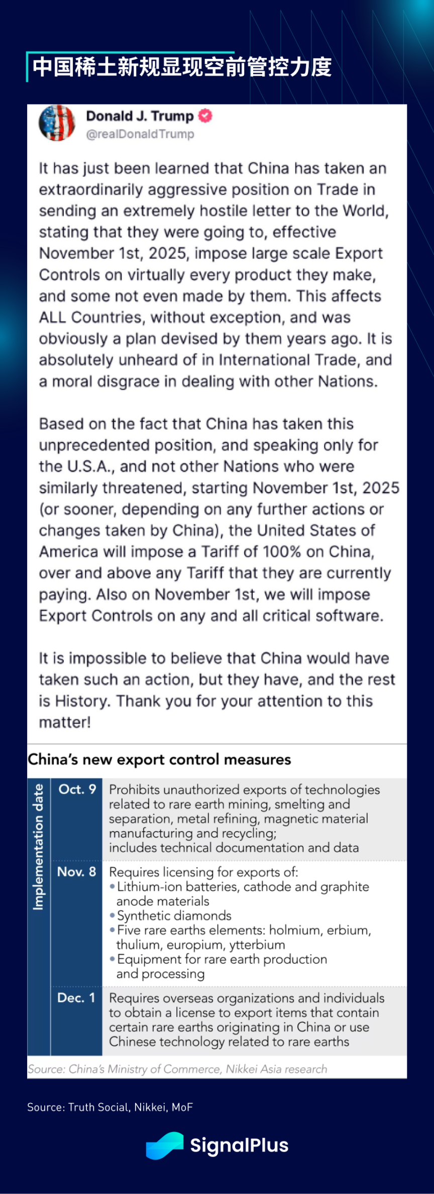 展望后市,得益于美中双方未进一步升级冲突,叠加美日市场长周末效应,周一市场出现技术性反弹。尽管主流观点认为近期争端只是「特习会」(目前存疑)前的博弈筹码,但我们认为宏观脱钩主题已因此加速推进。升级版稀土禁令绝非寻常挑衅,更凸显美国关税反制措施的效力衰退。