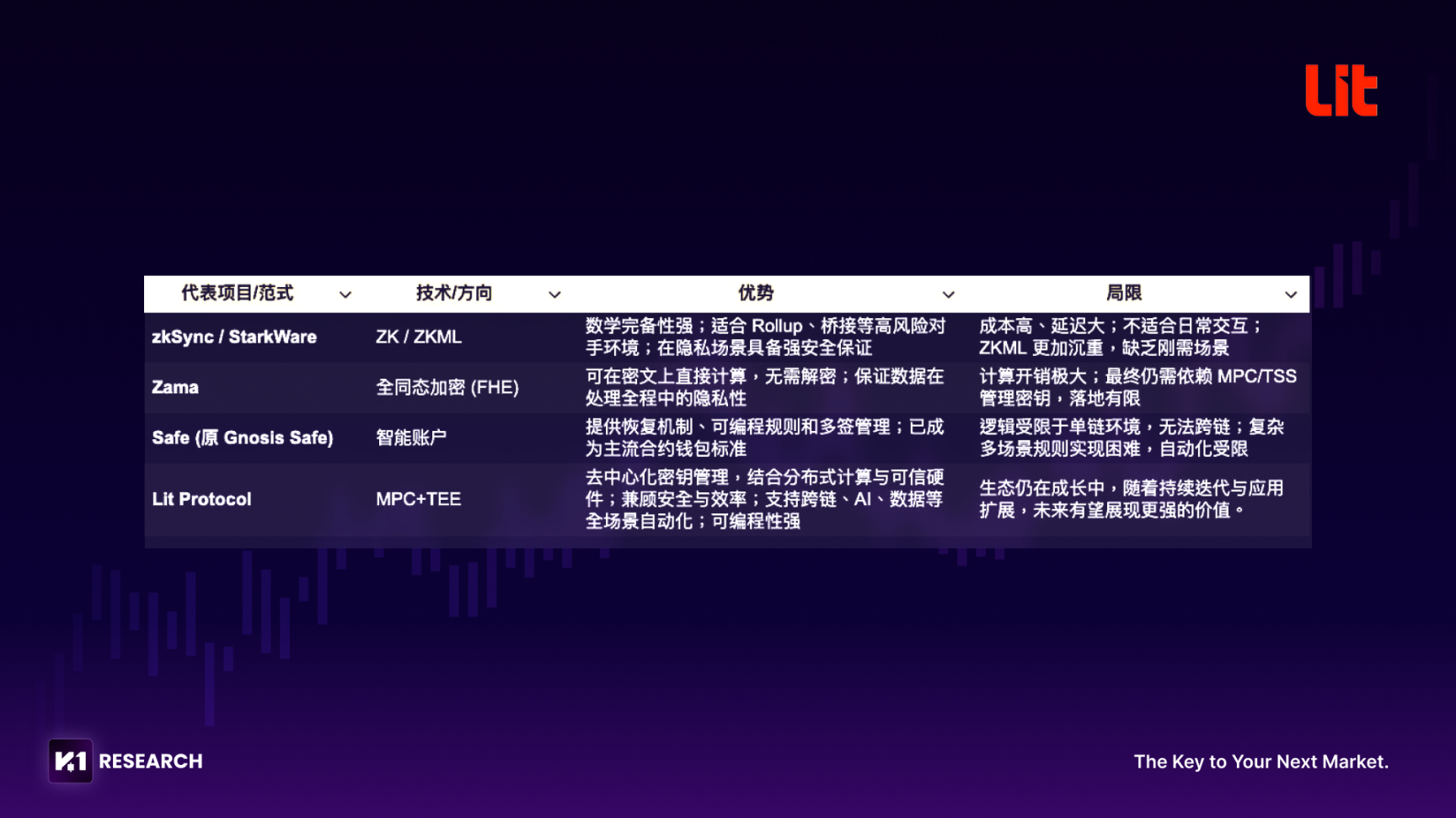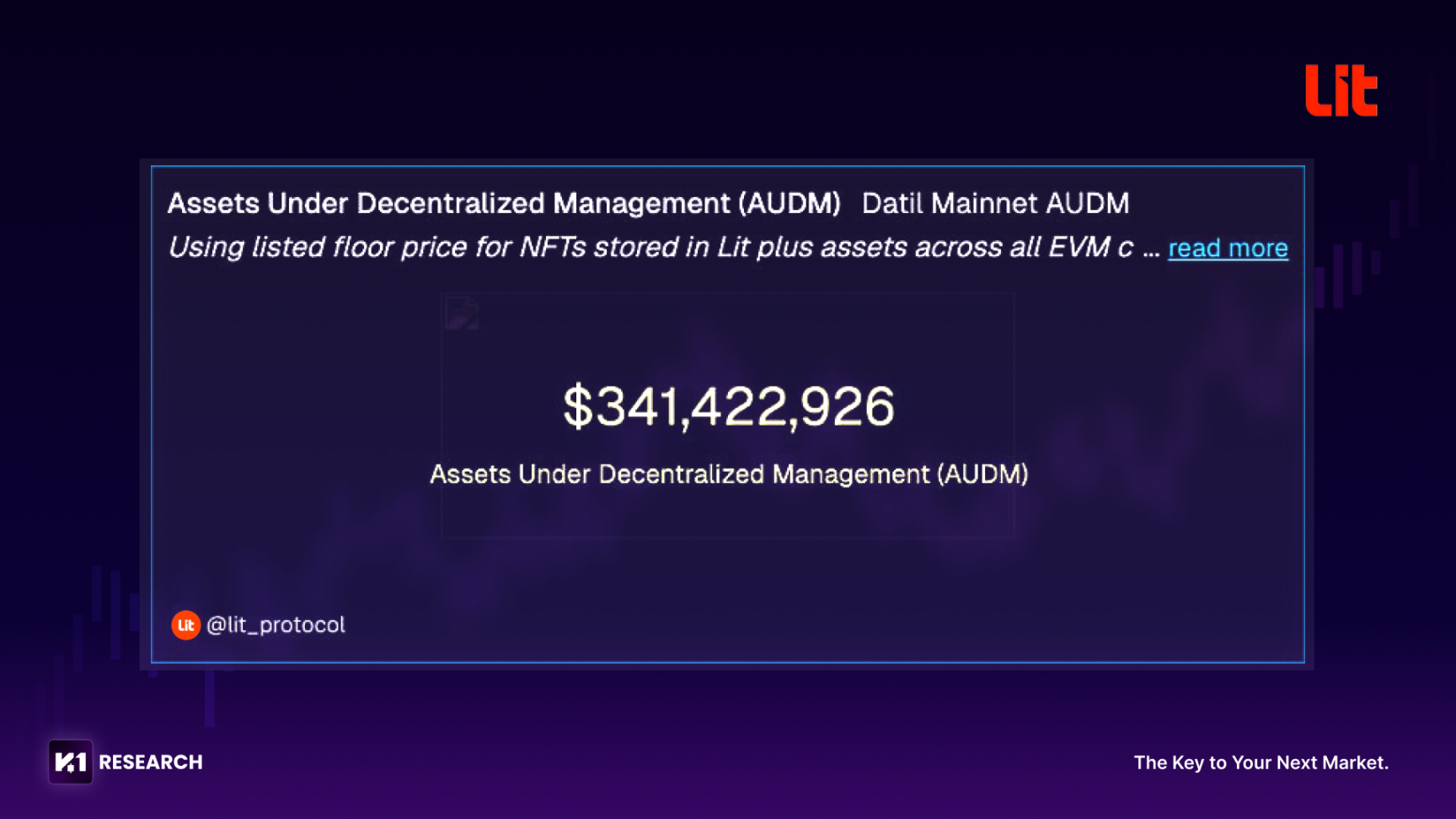 截至 2025 年 9 月,Lit Protocol 的产品已管理资产规模(AUM)超过 3.4 亿美元,覆盖钱包数量接近 166 万 个地址,已为 Alchemy、Lens Protocol、DataverseOS、Humanity Protocol 等多个项目提供密钥管理与访问控制服务。Lit 因其政策驱动的自动化与隐私保障以及在可编程签名与加密逻辑方面的创新,成为这一领域的领先者。