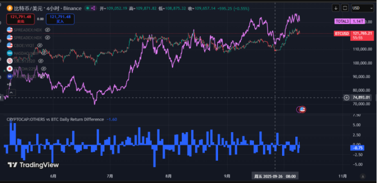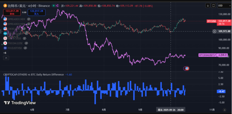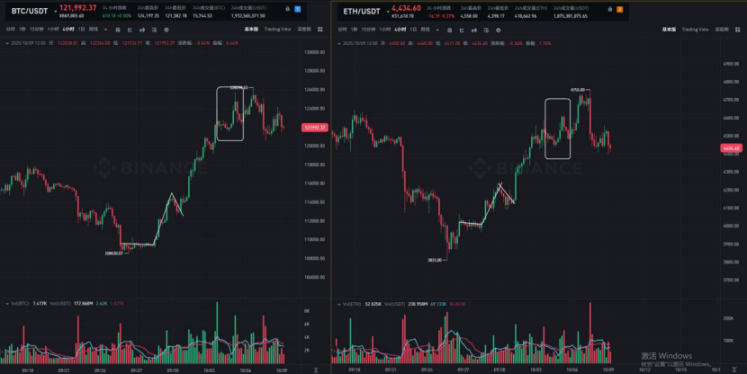 国庆假期期间,加密货币市场波动显著加剧。回顾节前走势,BTC 在 9 月 28 日前反弹乏力,呈现横盘弱反弹格局,而 ETH 则率先止跌。转折点出现在 9 月 28 日至 30 日,BTC 突然发力,一举收复了 9 月 25 日至 27 日的跌幅。此前弱势横盘后能快速收复失地,这一信号暗示市场技术面可能已发生转变,此前的空头思路应转为震荡或看涨。