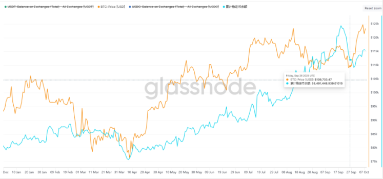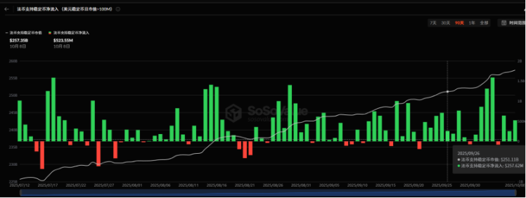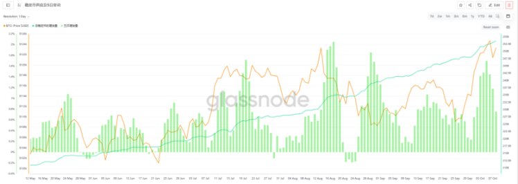 近期(9/27-10/9),稳定币总市值加速上升至 2536.22 亿美元。在近两周内,稳定币增发量高达 61.35 亿美元,日均增发 4.72 亿美元。相较于国庆前最后一周日均 2.83 亿美元的增发量,环比增幅达 66.7%。持续高位的稳定币增发为市场提供了充足的流动性,与大盘的强势表现形成印证。后续行情能否延续,需密切关注稳定币的增发态势。