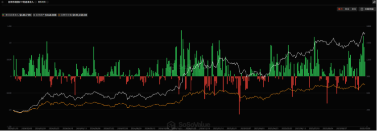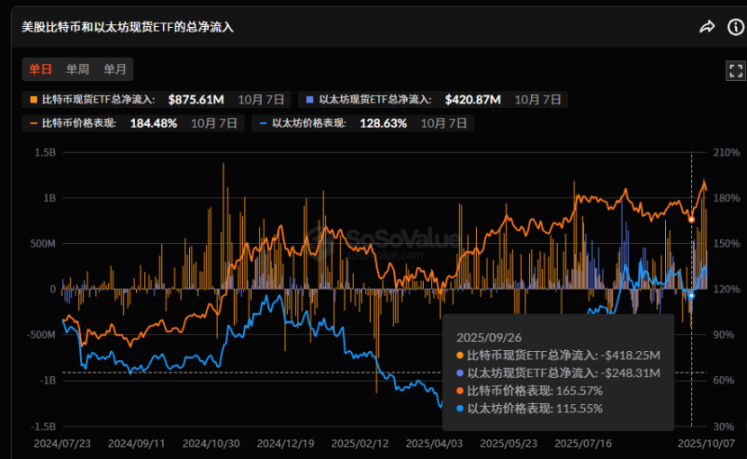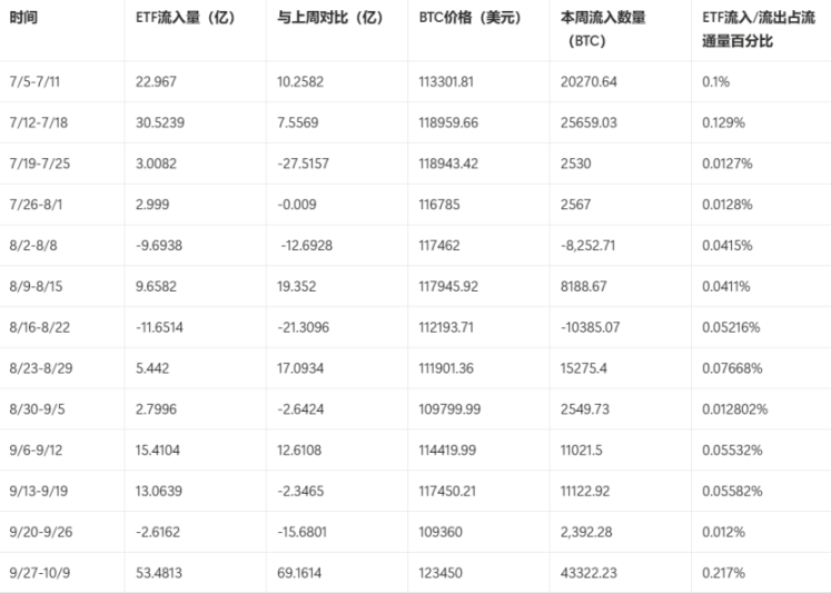 近期(9/27-10/9),比特币 ETF 资金出现了历史级别的强势流入。在近两周内,净流入高达 53.48 亿美元,相较于 9 月最后一周的轻微流出,实现了根本性逆转。与此同时,比特币价格强势走高并创下历史新高,表明本轮上涨主要由 ETF 巨额资金流入驱动。后市走势将紧密依赖 ETF 资金的持续性。