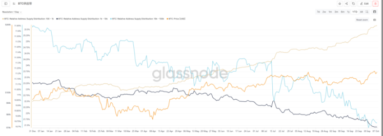 近期(9/27-10/9),持币量在 100 至 1K BTC 之间的地址占比持续上升,显示该群体处于持续吸筹状态。持币量在 10K 至 100K BTC 之间的大型地址占比也出现轻微拐头,有止跌企稳迹象,或开始吸筹。而持币量在 1K 至 10K BTC 之间的地址占比则延续下行趋势,表明这部分投资者仍在派发筹码。