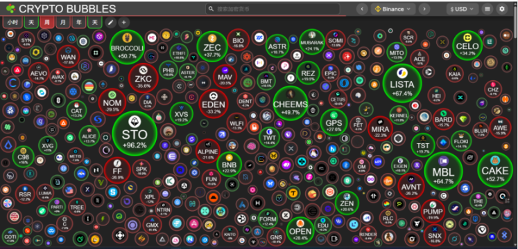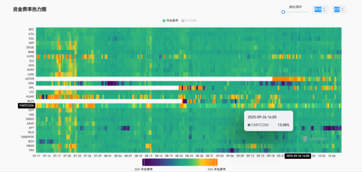 从各山寨币的资金费率颜色映射来看,本周市场情绪明显边际走强。随着大盘在新高附近震荡,山寨币市场的交易热情被有效调动。