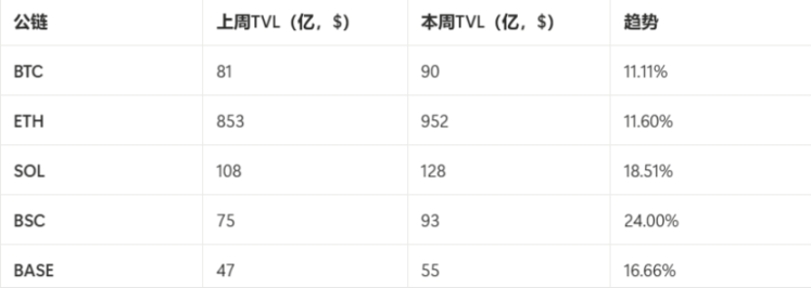 本周各公链 TVL 普遍大幅上涨,其中 BSC 链涨幅居前,表现突出。