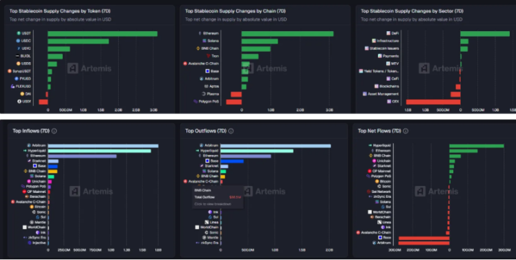 法币支持稳定币本周净流入约 70 亿美元,流入幅度显著,流速平稳。