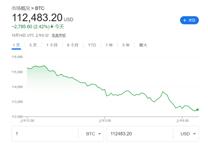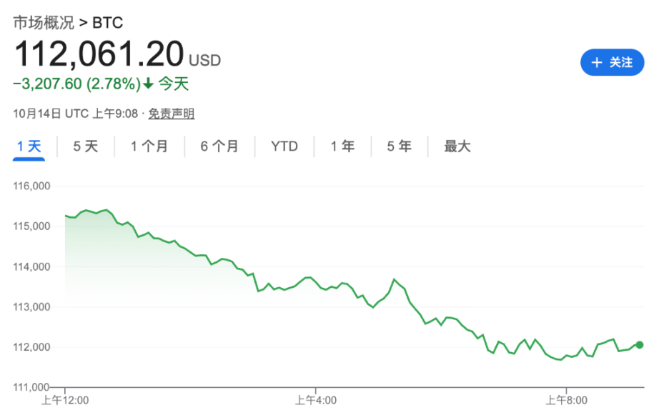 比特币一度暴跌 3.75%,现报 112061.2 美元 / 枚。CoinGecko 的数据显示,市值较小、波动性较大的代币跌幅更大,导致所有加密货币的总市值在 24 小时内缩水超过 1,500 亿美元。
