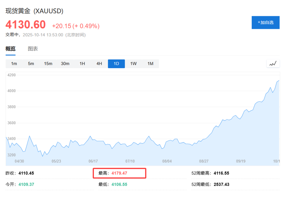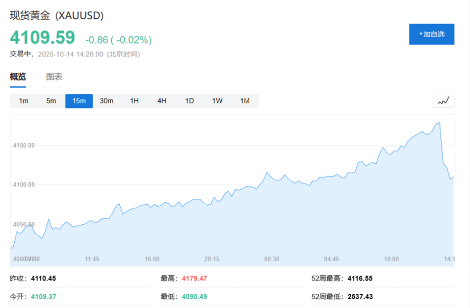 与此同时,现货黄金短线急跌超 40 美元,现报 4130 美元 / 盎司,此前一度涨破 4170 美元。