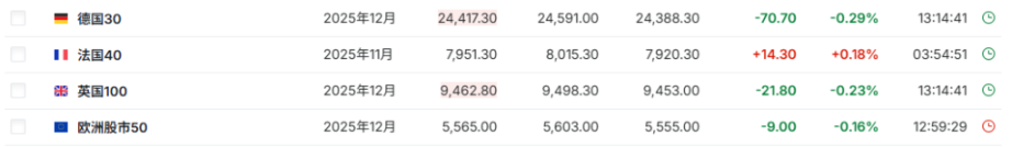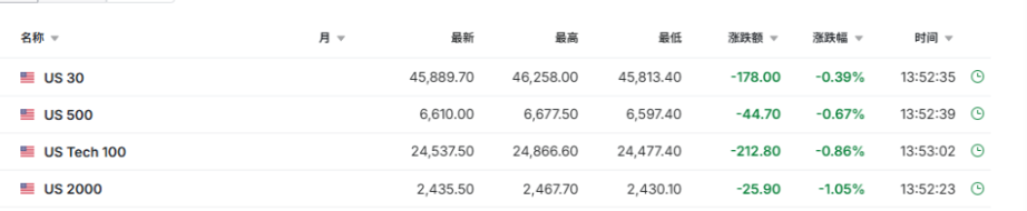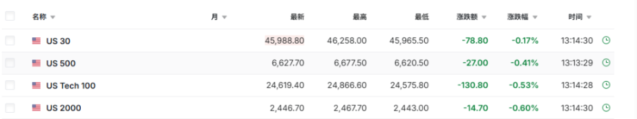 今日亚市盘中,美国股指期货下跌,标普 500 指数期货下跌 0.4%,纳斯达克 100 指数期货下跌 0.5%。德国、英国等主要股指小幅下跌,欧洲股指 50 指数跌 0.16%。