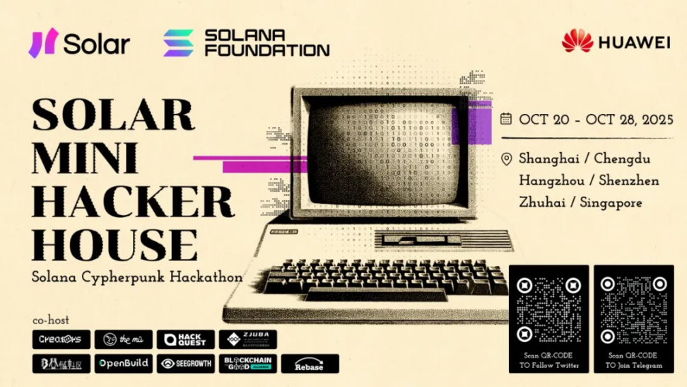 这个秋天,Solana 生态热潮再起!由 Solar 主办,华为、BGA 支持的六城 Solana Cypherpunk Mini Hacker House 即将席卷成都、上海、杭州、深圳、珠海、新加坡!诚邀每一位心怀代码与梦想的你,加入这场属于开发者的线下极客盛宴!