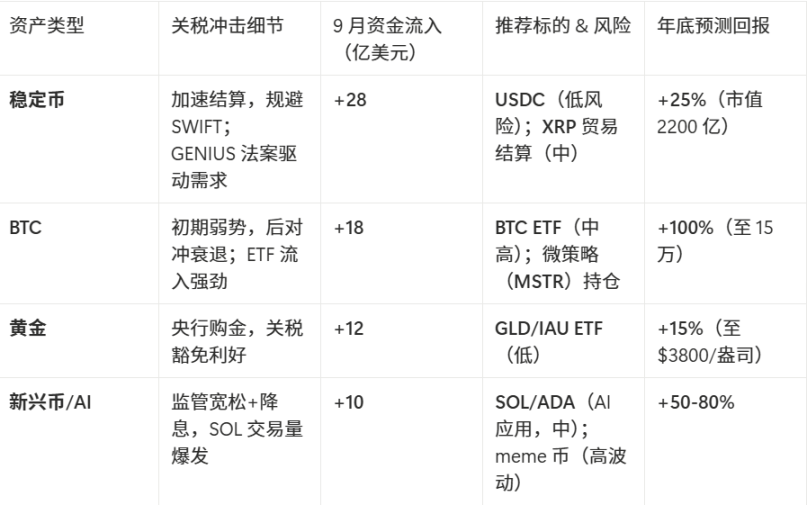 风险:尽管前景乐观,但风险依然存在。10 月关税生效可能推高衰退概率,市场波动性依然较高。建议设置止损点,并保持仓位分散,单项投资不要超过总仓位的 10%。