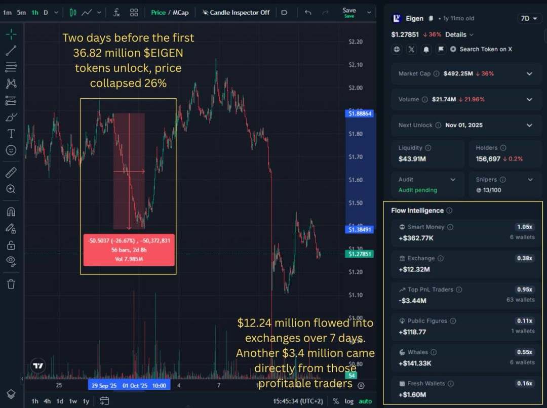 时间线与 10 月 1 日的首次解锁事件相吻合,当时 $EIGEN 在数月限制后开始可以交易。在首批 3682 万枚 $EIGEN 解锁前两天,价格就已暴跌 26%。