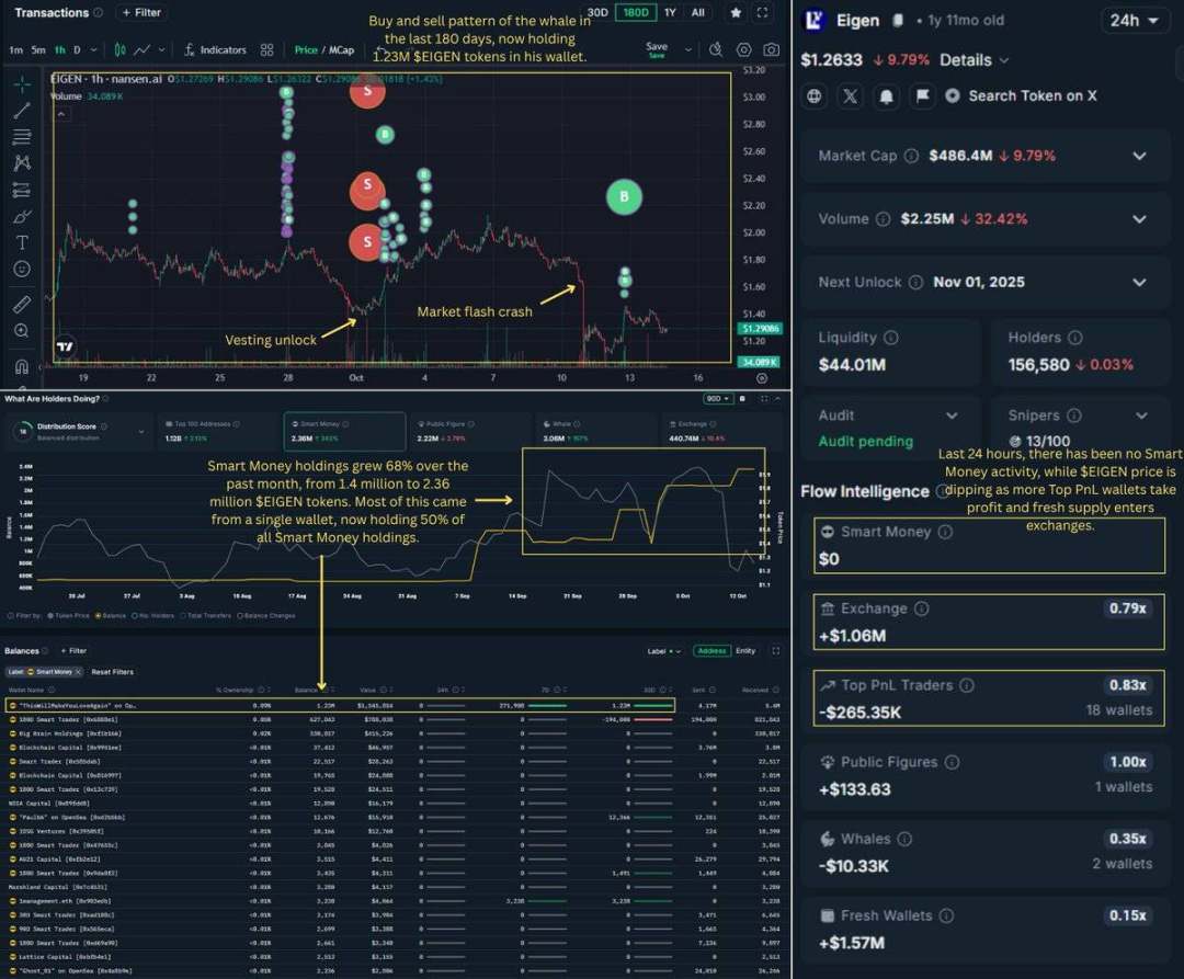 在过去的 30 天内,68% 的 $EIGEN 最赚钱的交易者已经退出市场。他们并不是因为 10 月 10 日的关税暴跌而恐慌性抛售,而是提前布局,规避即将到来的 24 个月供应冲击——这一冲击的首次解锁发生在 10 月 1 日。