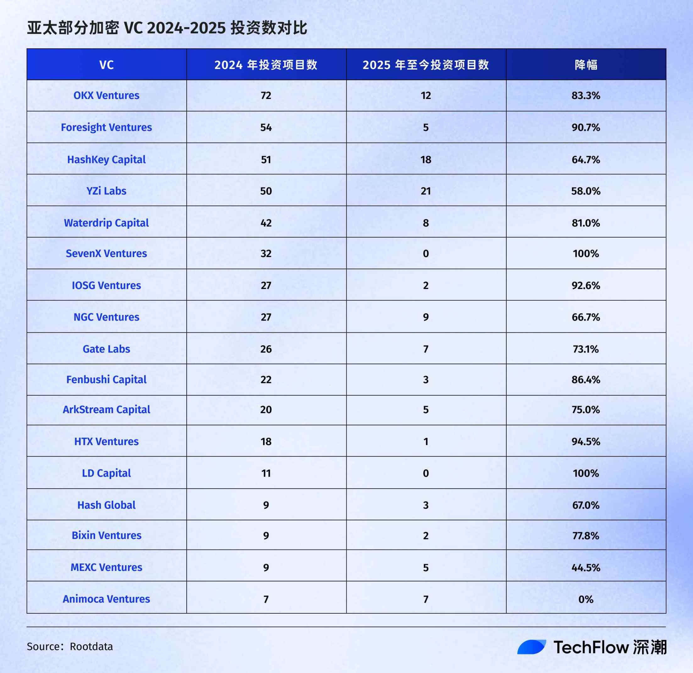 RootData 的数据显示,相较于 2024 年,2025 年至今亚洲加密 VC 在一级市场出手次数呈现断崖式下跌。