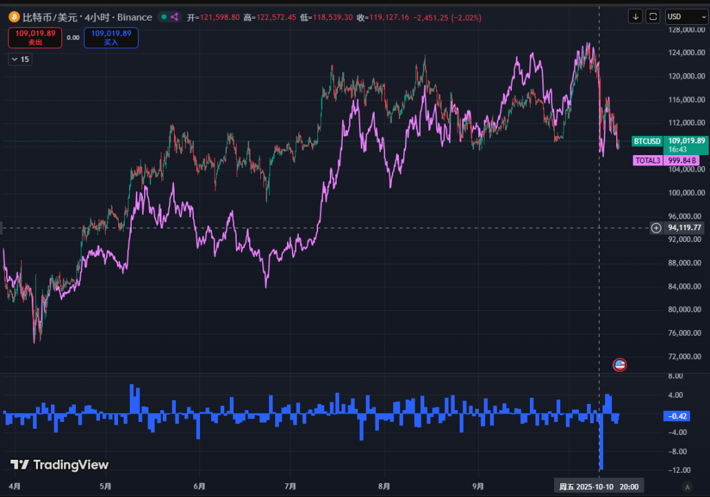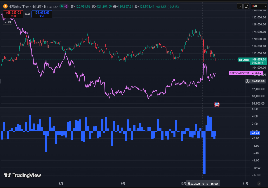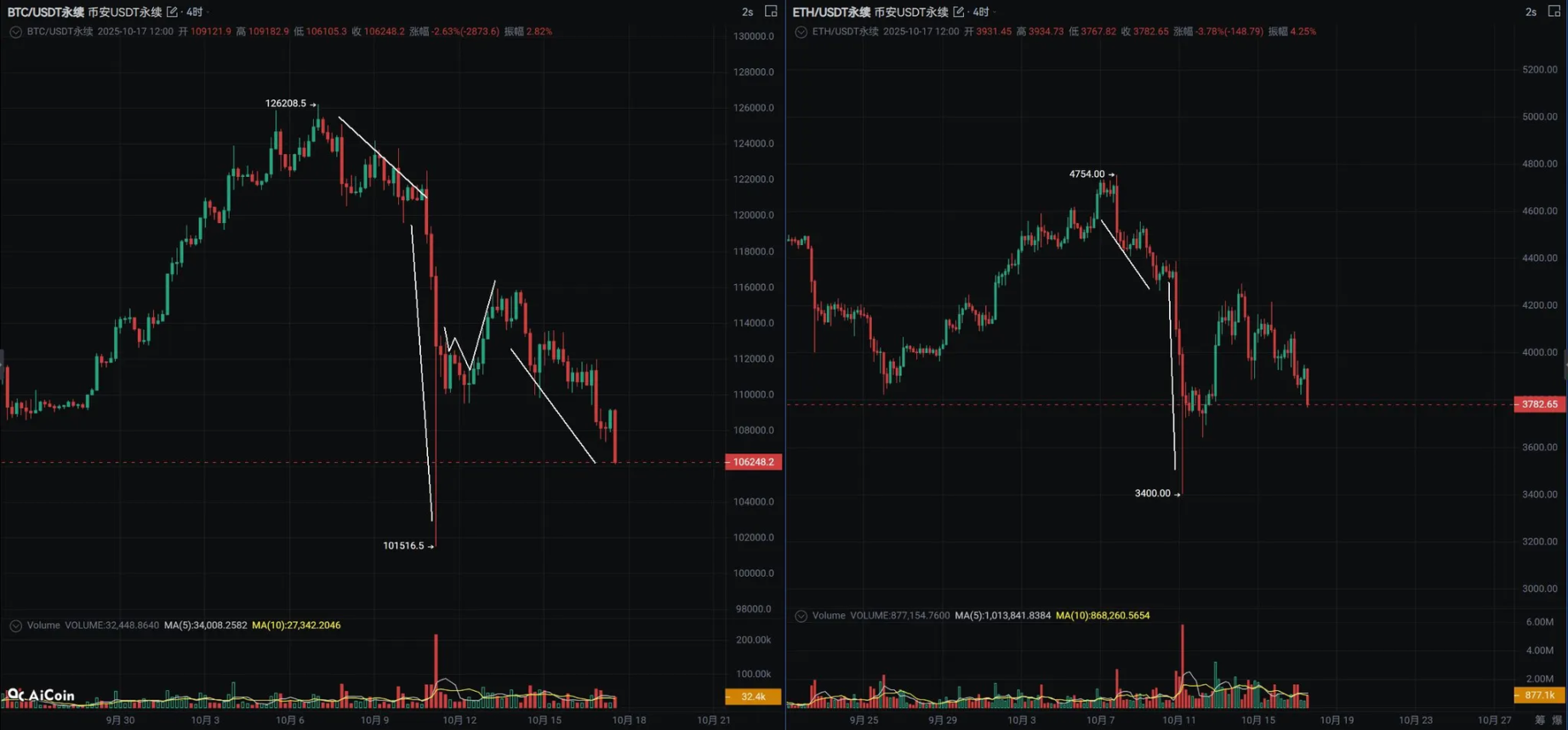 本周的行情,可以说是波动巨大、历史罕见,首先在 10/10 号之前,市场初步回调,毕竟前面刚连续日线拉升,直接创了新高,初始的调整并不深,10/10,中美贸易摩擦加剧,晚上 11 点 -12 点,美股直接下杀,下杀幅度相对美股自身较大,且流畅,币圈也破位,当时应该可以观察市场的情绪,并不乐观,然后市场流畅下跌,10/11 号出现了非常惨烈的市场崩盘,山寨币普遍回撤 50% 以上,USDE 脱钩,市场大量爆仓,市场急跌之后,短线资金再次涌入,出现超跌之后的修复反弹,当天第一次修复在 112000 受阻,回调后,第二次修复在 116000 受阻。逻辑上这种对市场的破坏性,不是一次性能修复的,市场起码进入震荡,市场回调到 10/16 号的时候,接近震荡区间下轨,反弹不起,市场承接弱势继续下跌。