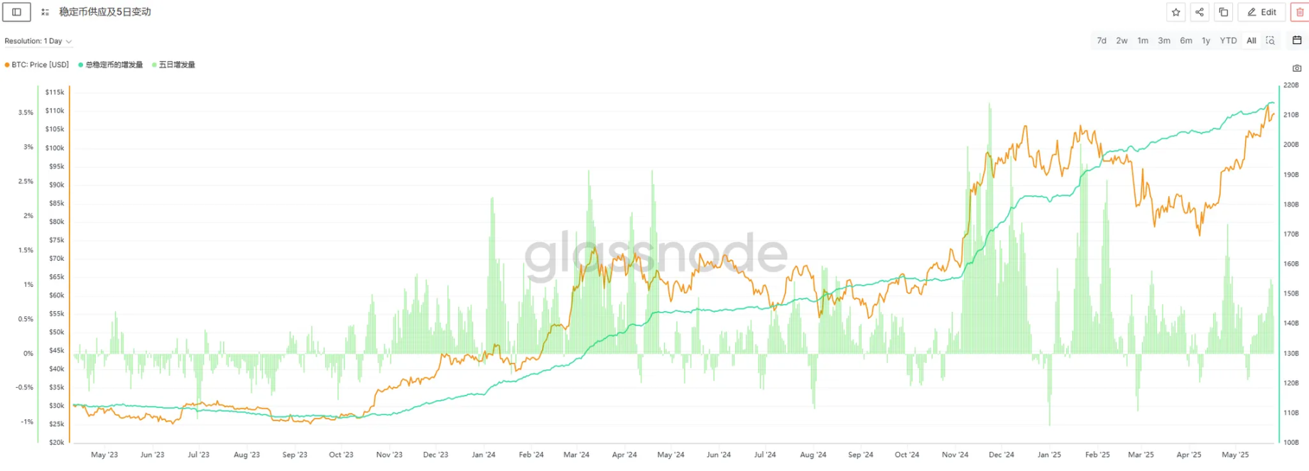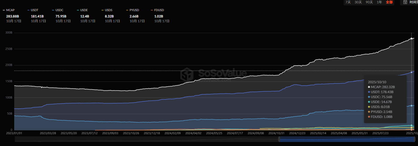 本周(10/10-10/17)稳定币总规模续创新高,达 2573.48 亿美元,单周增发 37.26 亿美元,日均增发 5.32 亿美元,较前两周的 4.72 亿美元日均增发量小幅加速。回溯近三年数据可见,BTC 上行周期中稳定币增发常同步加速,震荡或调整周期则明显减速。尽管本周市场回调幅度较大,但从稳定币增发节奏判断,BTC 大级别上行趋势尚未终结,10 月 11 日的下跌暂可定义为正常回调。