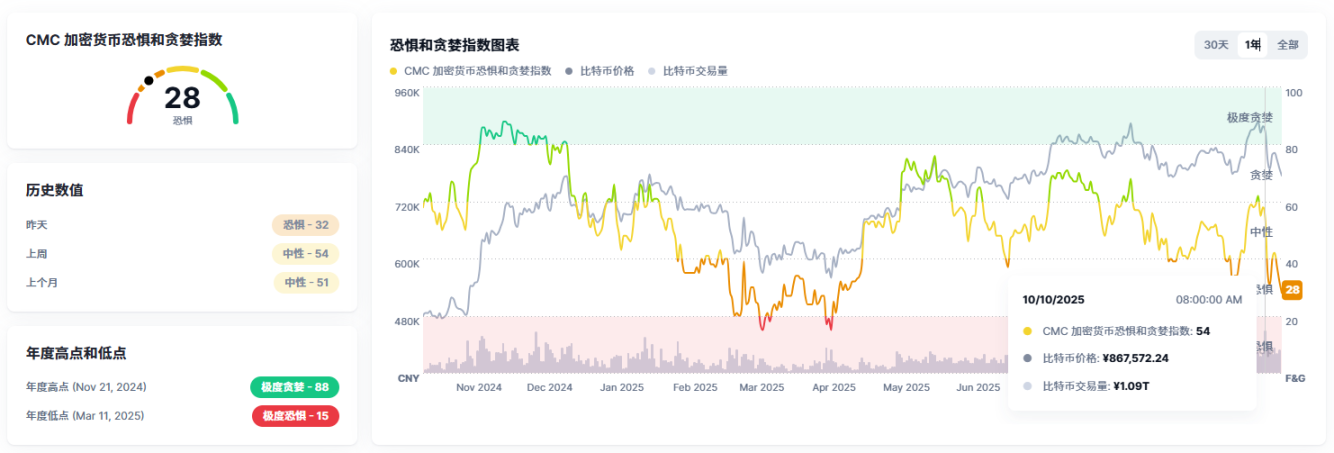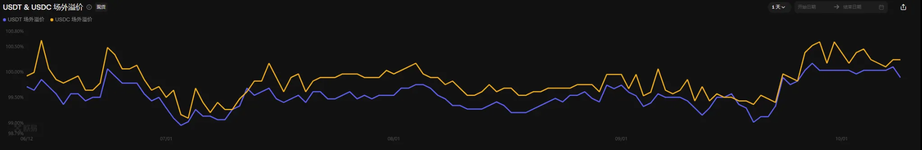 本周(10/10-10/17)USDT 与 USDC 的场外溢价率呈现明确信号:10 月 11 日市场大跌后,溢价率大幅攀升,反映大量场外资金借机抄底;10 月 12-15 日市场反弹期间,溢价率持续维持高位;但后续市场二次探底时,溢价率反而回落。结合市场走势判断,当前反弹仅为大跌后的首轮自然修复,后续需持续跟踪场外溢价率能否在新一轮反弹中体现出持续的 FOMO 情绪。