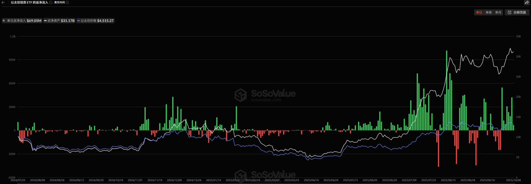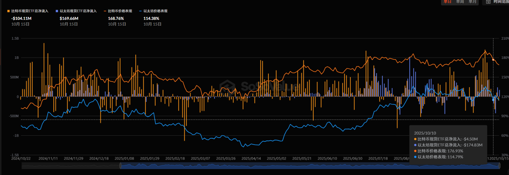 本周(10/10-10/17)以太坊 ETF 同样结束前期流入,单周净流出 2.6289 亿美元(前两周净流入 17.1916 亿美元),以太坊价格也随 BTC 同步加速回调。与比特币类似,以太坊后续能否开启新一轮大级别上行,核心仍需观察 ETF 资金何时重回净流入轨道。