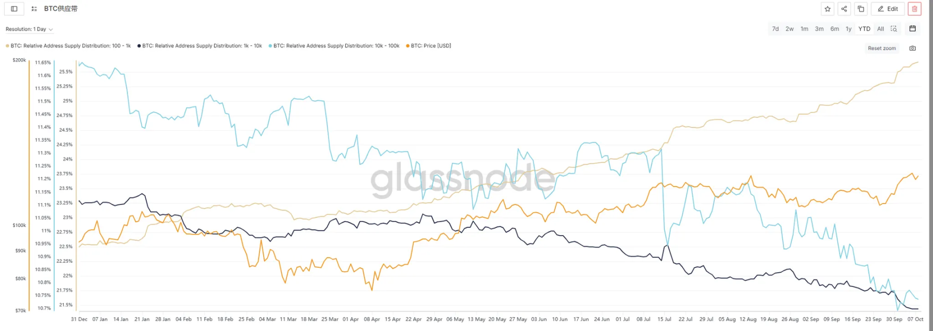 本周(10/10-10/17)比特币持币地址结构呈现分化:
