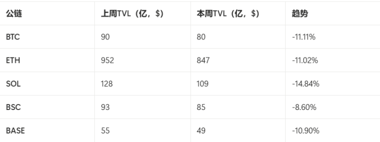 本周链上 TVL 较大幅度下跌,特别是 sol 链 跌幅居前。