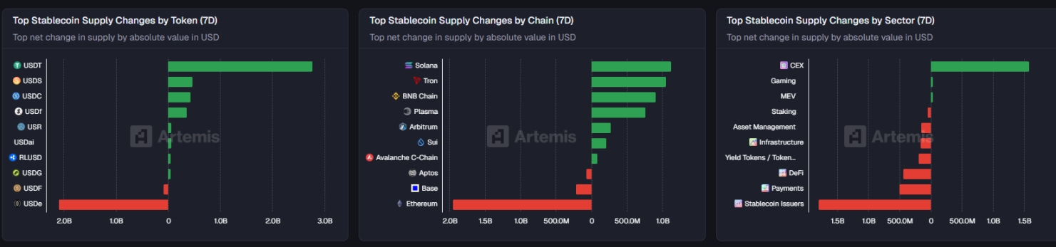 本周稳定币增发最多 usdt,usde 出现了大幅的缩减,cex 出现较大的净流入,其他的板块稳定币均出现不同程度的降低。非常的明显的 降杠杆过程。