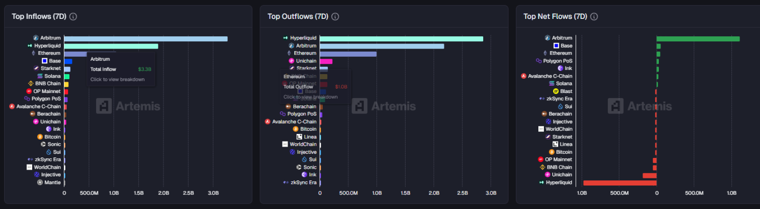 周链上 DeFi 桥接资产流向方面,净流入最多是 arb 链,净流出最多 hype 链,hype 该链是链上最大合约持仓交易市场,本周的极端表现出现了缩减交易杠杆的行为。