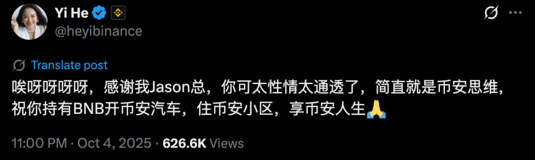 不得不感慨,何一简直就是营销鬼才。“币安思维,买 BNB 开币安汽车,住币安小区,享币安人生”,这一华语世界的“苹果”名梗和 Meme 这一造富神话的印钞机对撞,投机、反叛、共情、群体性幻觉……所有元素交织成完美风暴。