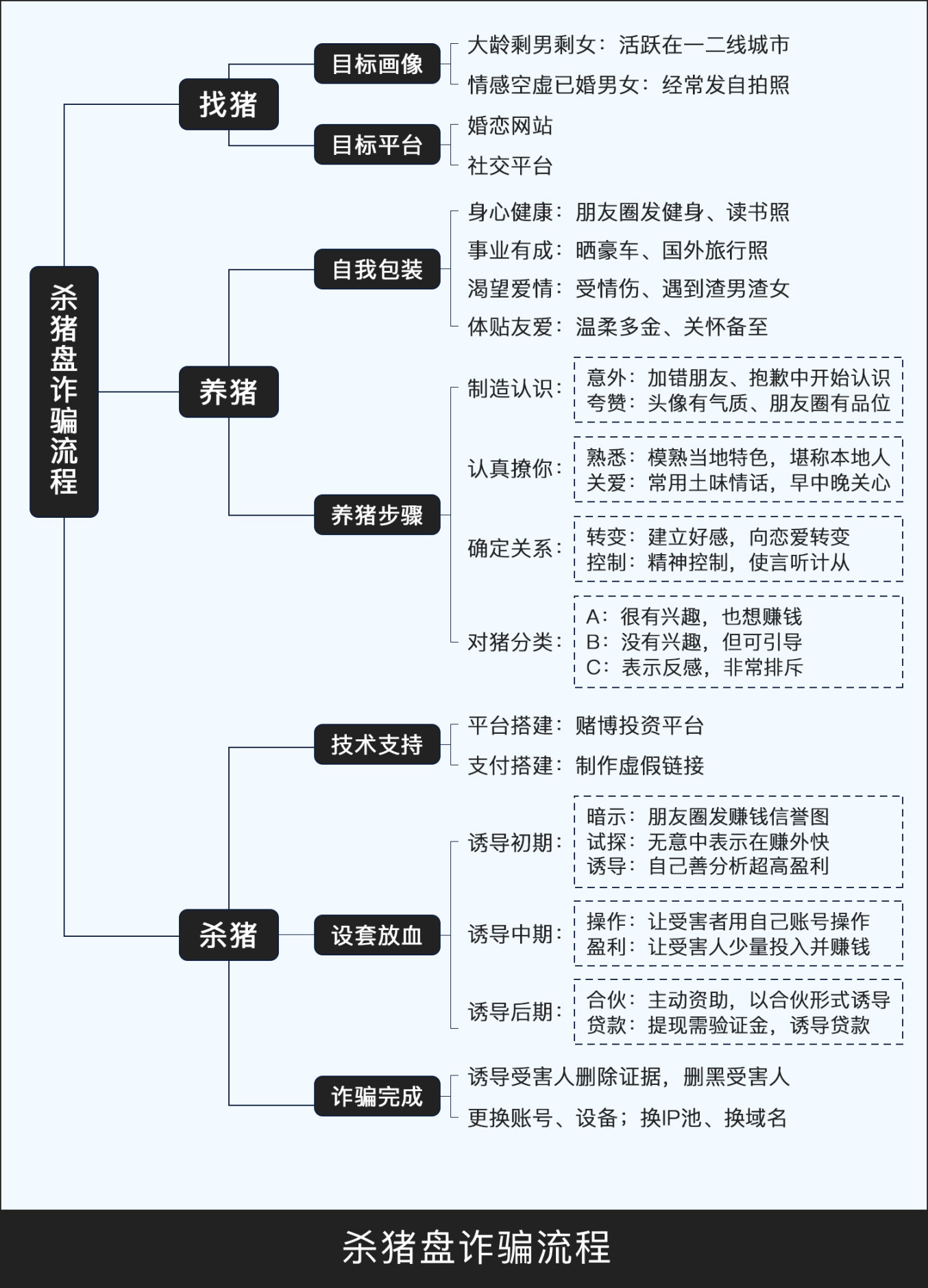 “杀猪盘” 是单案损失较大的网络诈骗,诈骗份子借社交平台以交友、婚恋为幌子,先骗感情再行骗,还常用黑话指代诈骗环节,如称受害人 “猪” 、交友过程 “养猪” 、骗钱环节 “杀猪” 等。