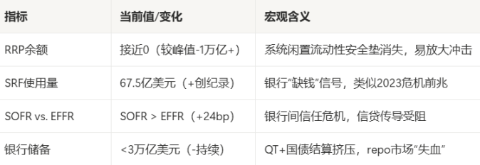 美联储主席 Powell 于 10 月 14 日表态,QT(量化紧缩)结束 “已不遥远,但仍需一段时间”,这与当前流动性挤压现状高度契合 ——T-Bill 发行潮正推动美联储提前终止 QT,甚至可能转向更多流动性注入操作。10 月 FOMC 会议(10 月 29-30 日)降息 25bp 的概率已升至 95%;若 SRF 使用量持续飙升,不排除美联储启动紧急措施(如重启 BTFP 工具)的可能。