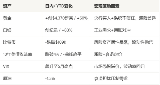 黄金作为 “传统避险资产”,受益于美元走弱与地缘风险(如美中贸易摩擦);而比特币的 “数字黄金” 神话破灭,凸显其与权益资产关联的 beta 属性。全球市场方面,欧洲股市逆势上涨,但亚洲股市开盘承压,进一步凸显美债的 “安全港” 地位。